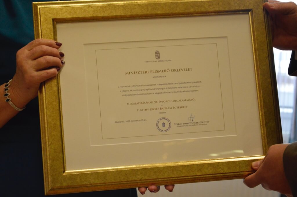 Az egyesület elnöke honvédelmi miniszteri Elismerő Oklevelét, az MH 1. Területvédelmi Ezred parancsnokának, a Bajtársi Egyesületek Országos Szövetsége elnökségének, a Bajtársi Egyesületek Országos Szövetsége Közép-magyarországi Régiójának az Emlék Plakettjeit vehette át az egyesület elnöke.