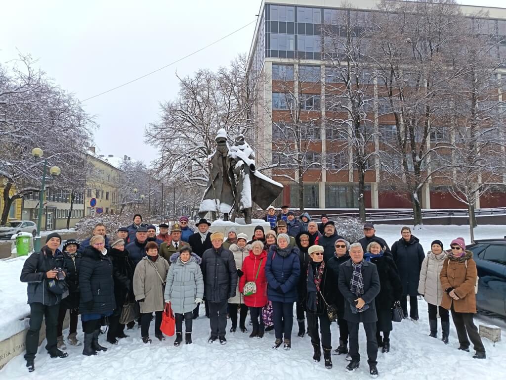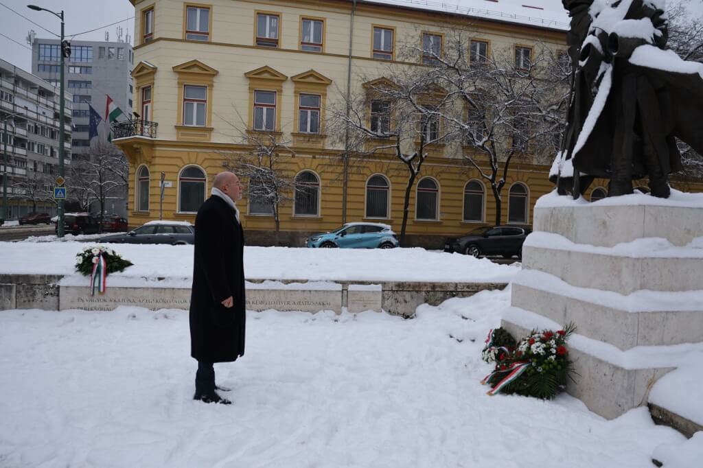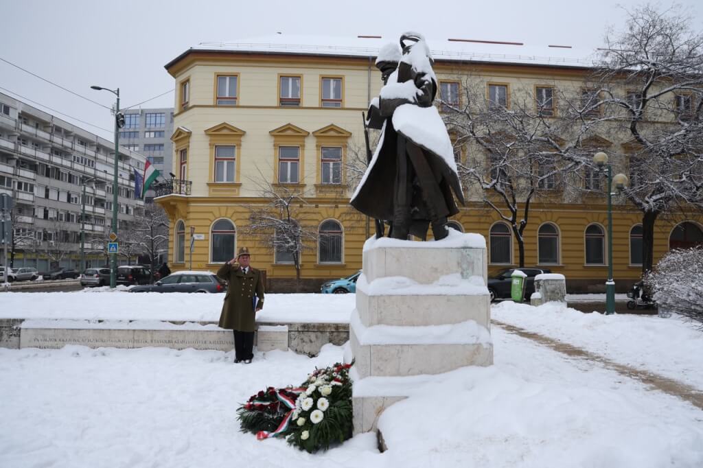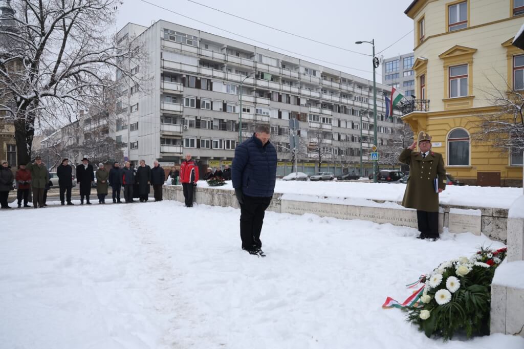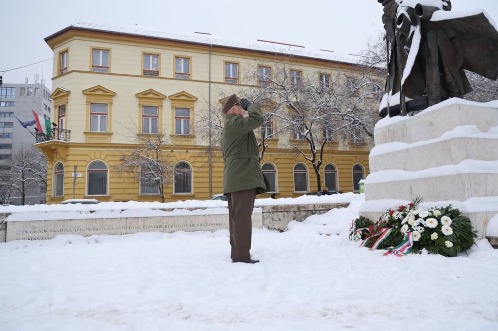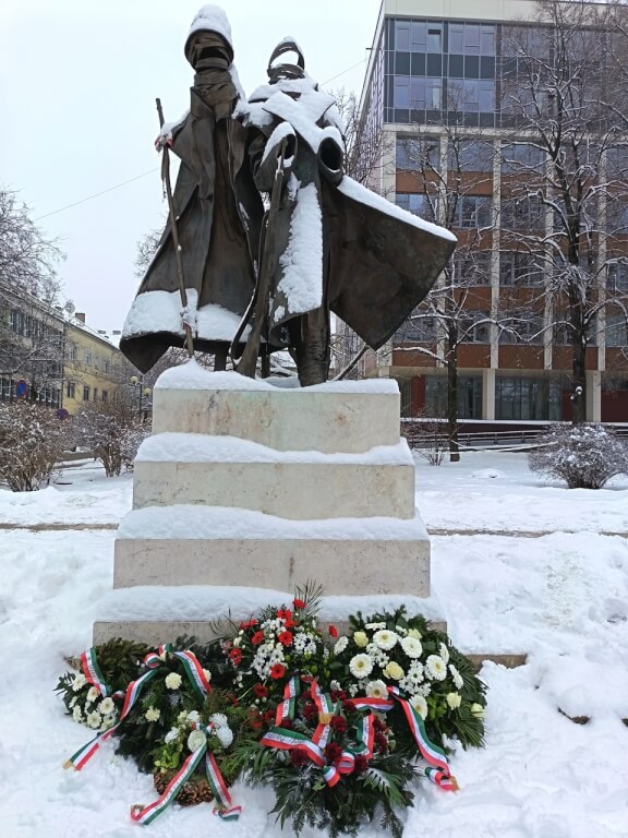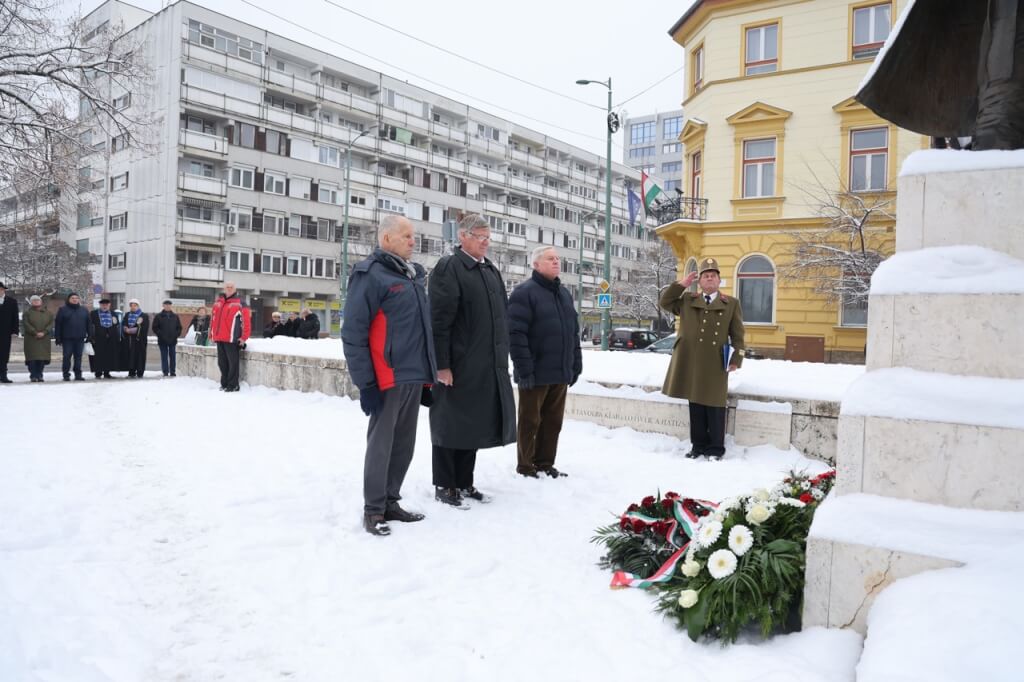 A koszorúk elhelyezése előtt mindannyian meghallgattuk Sinkovits Imre előadásában Vihar Béla: Egy katona megy a hóban című költeményét.