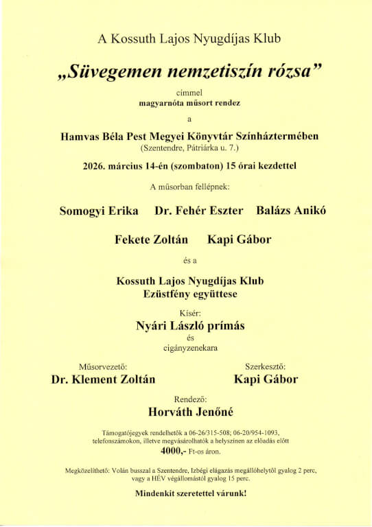 Ez év március 14-én 15.00-órától az 1848-49-es forradalom és szabadságharc évfordulójának tiszteletére a Klub és Kapi Gábor nyugállományú százados „Süvegemen nemzetiszín rózsa” címmel újból megszervezi a magyarnóta délutánt.