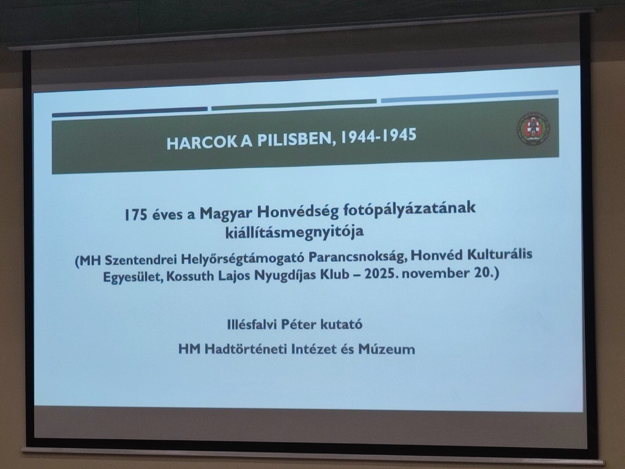 Az MH Szentendrei Helyőrségtámogató Parancsnokság, a Honvéd Kulturális Egyesület és a Kossuth Lajos Nyugdíjas Klub 2025. november 20-án 09.30-tól szervezte meg, a 175 éves Magyar Honvédség fotópályázatának alkotásaiból rendezett országos kiállítás sorozat záró kiállításának megnyitóját az MH Szentendrei Helyőrségtámogató Parancsnokság Művelődési Otthonában.