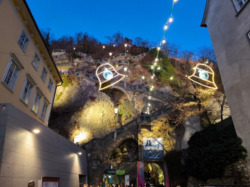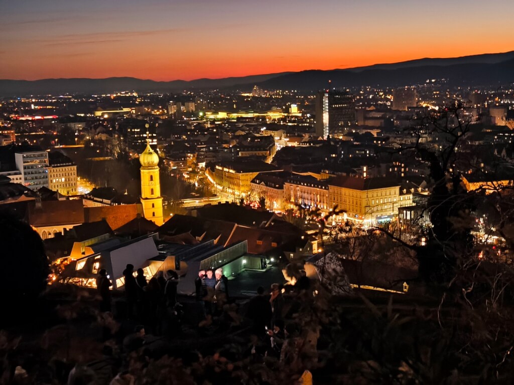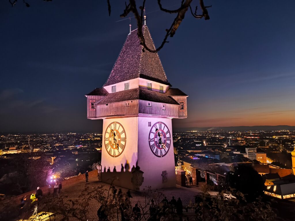 A híres üveglifttel könnyedén jutottunk fel a hegy gyomrában a Schlossbergre. A Schlossberg híres óratornya a „Uhrturm” Graz egyik legismertebb szimbóluma. Az óratorony előtti térről páratlan kilátásban gyönyörködhettünk.