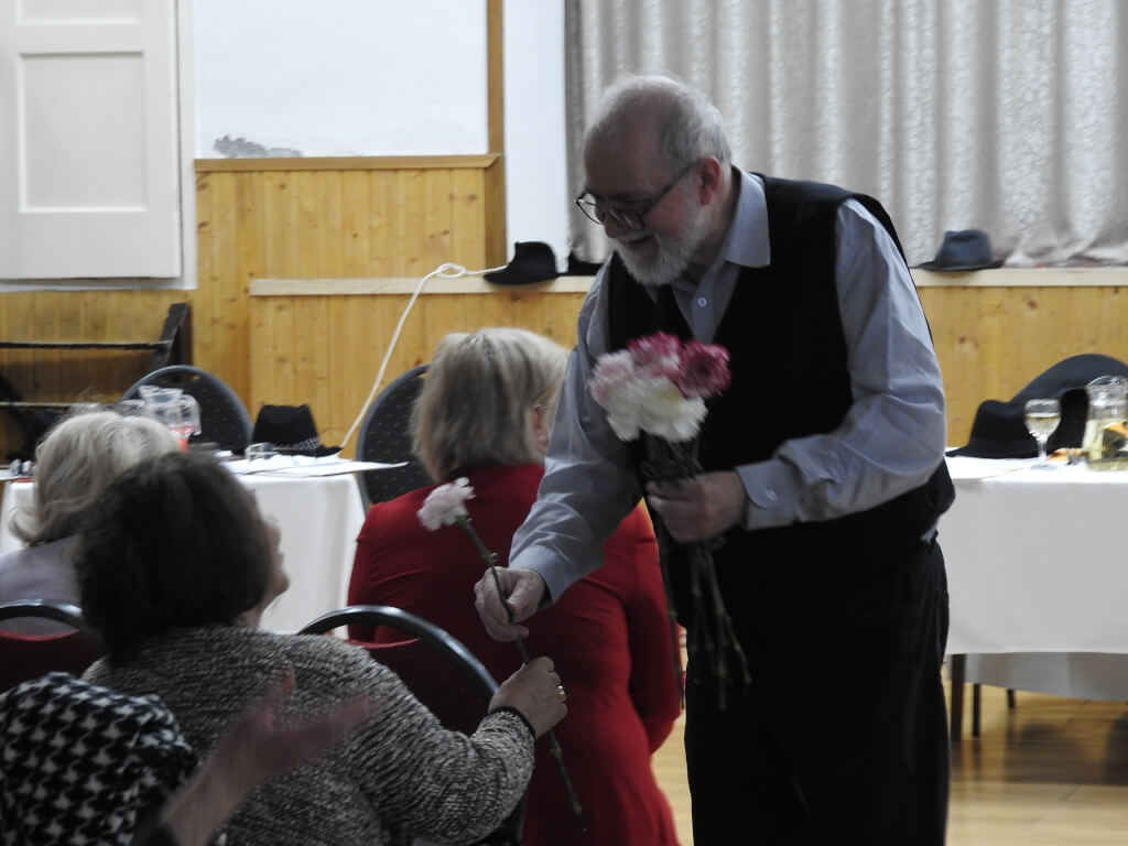 Köszönetet mondott a hölgyek tapsaiért és felkérte a szereplő férfiakat, hogy a megjelent hölgyeknek egy szál virág átadásával kedveskedjenek a Nemzetközi Nőnap alkalmából. Természetesen virágok átadása alatt is szólt a citera, hogy a hangulat továbbra is megmaradjon.