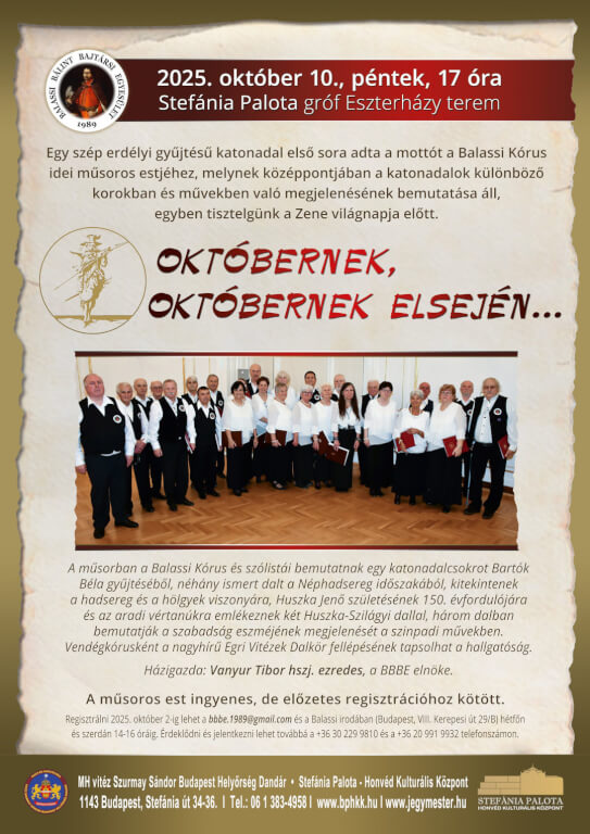 Október 10-én – mint már jó néhány alkalommal-, ismét a Balassi Kórusé volt a Stefánia Palota emeleti nagyterme, hogy az őszi koncerttel megörvendeztesse a közönséget. Sok ismerős arcot lehetett látni, hiszen „a zene mindenkié”, ahogy Kodály Zoltán mondta. Megtelt terem és a zsibongásból érezni lehetett a kellemes várakozást. Október elseje nem csak az Idősek Világnapja, hanem a zenéé is. Arról sem feledkezhetünk meg, hogy anno ilyenkor kezdődött a legények sorozása.