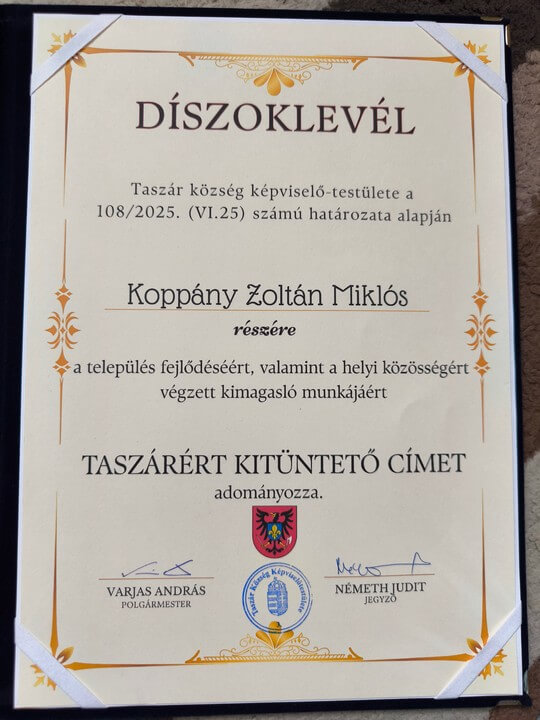Ezután a taszári Képviselő- Testület döntése értelmében, Taszárért Kitüntető Cím elismerésben részesítette Koppány Zoltán nyugállományú századost a Magyar Veterán Repülők Somogy Megyei Egyesületének elnökét.