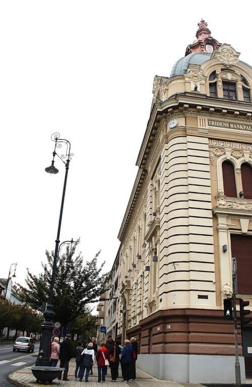A Turul szobor történetét hallgatva, megtudtuk, hogy 1933. év pünkösdjén impozáns ünnepség keretében avatták, majd a ii. világháború után eltávolították.1990. június 3-án állították vissza a Turulmadarat és az Országzászló tartóoszlopát, melyeket az 50-es években eltávolítottak és beolvasztásra ítéltek, de a Dunántúli Kőolajipari Gépgyár munkásai a beolvasztási parancs ellenére eldugták és megmentették. Ugyanezen gyár munkásai újjávarázsolták, és ma ismét gyönyörű ez a madár, melynek széttárt szárnyai a város számára a védettséget szimbolizálja. A Bankpalota sarkán állva hallgattuk létrejöttének történetét, majd áttekintve a túloldalra, láthattuk a Bogenrieder palotát, melyett Bogenrieder József 1914-ben építetett fel szecessziós stílusban, és nyaralószerű kialakításban. Az épületet kivitelezője Merbl Arnold temesvári műépítész volt.